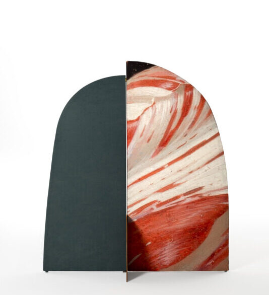 Kazimir screen Type B is composed of 2 rounded wooden panels, upholstered and coated with a removable jersey dress with a yellow side and a decorative motif with flowers, taken from a Flemish painting of the 17th century . The panels are connected by a semi-oval rusted “corten” steel base, finished with natural wax, and two magnets covered by a brass ring.