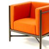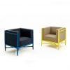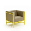 Beech wood armchair yellow lacquered, with 4 squared upholstered cushions. We’re available for C.O.M. fabric. Ask for our selection of fine fabrics and leather